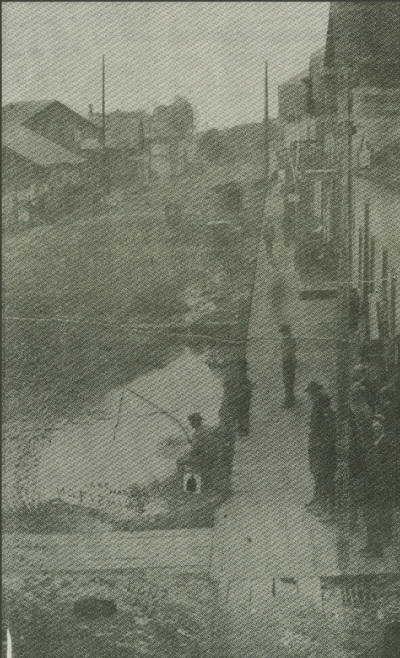 An 1870’s view of East Sixth Street at the Hewett Street intersection: At that time, Sixth Street was Neillsville’s main business street and the original “Snake Street,” a nick-name given to Seventh Street in later years. As the Photo indicates, it was the days of boardwalks and un-surfaced streets. There were livery stables, the old Wisconsin House Hotel (sometimes referred to as the Foster House) plus other clapboard wooden structures occupied by businesses on both sides of Sixth. Note the electricity pole on the corner. The lower portion of the pole was wrapped with wire to discourage horses from chewing on the wood, a pat-time while they were tied to the post, waiting for their owners to return from shopping. The fisherman sitting with pole in hand is believed to have been the trickery of the photographer who spliced that into the photo.