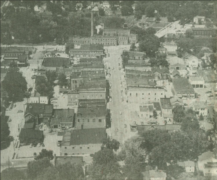 A photo as Neillsville appeared when Clark County reached the Centennial Mark in 1953, an aerial photo. Hewett Street at the center, with the milk Condensery in the background.