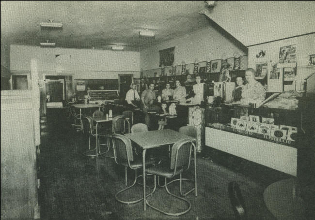 The Wagner Café interior as it appeared in 1942-1943, standing behind the counter, (left to right): Art Wagner, Mrs. De Cremer, Marie Keller, Ruby (Wedekind) Walters, Betty (Wagner) Blescasek, and Mrs. Wagner. Seated at the counter, (left to right), Henry Becker, Henry’s brother and Brian “Tinker” Becker with a puppy. In the back of the room, the bar entrance is also visible. A poster advertising the movie “Son of Fury” featuring Tyrone Power as main actor and Gene Tierney as actress to appear at the next door theatre is tacked to (the) wall behind the counter. Also, a photo of General MacArthur reminds us that the photograph was taken during World War II, as Mac Arthur was leader of the Allied troops in the Pacific Conflict. The enclosed glass showcase displayed the many brands of cigars, La Palina, El Producto, Dutch Masters, White Owl, harvester, etc. Cigars were very popular amongst the “smokers” of tat time, evident by the large display. (Photo courtesy of Doris Simonson whose mother, Marie Keller, is in this picture)