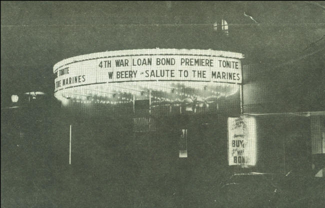 A night time view of the Neillsville theatre marquee, brightly illuminating the name of the featured film; The title “Salute to the Marines” with Wallace Perry, and the War Bond effort, depicts the era that the photograph was taken. (Photo contributed by Mrs. William (Dorothy) Meier.)