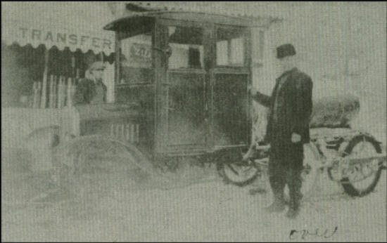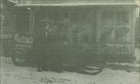 Zilk with sales valise, standing in front of one of his snowmobiles, converted pickup trucks used only for winter travel. His office was in the building then located between the Green Lantern and Bollum's Store and is no longer there.