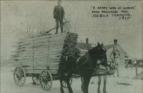 In the years of 1909-1910, he drove teams hauling wagon loads of lumber to Oshkosh. A one-way trip from Stetsonville to his destination in Oshkosh took three and one-half to four days travel, over all kinds of roads. At the end of each day, he would stop at a farm or at a small town residence and ask for lodging, dependent upon them to have feed and barn space for his horses as well as food and bed for himself. While he worked at the Hollister Mill, he lost two fingers on his right hand.