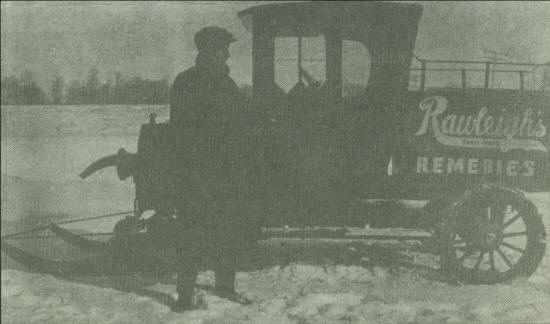 Zilk’s idea for a snowmobile was derived out of necessity. After he came to Neillsville, circa 1914, he started a business as a Rawleigh Salesman. There are some of us who remember the Rawleigh salesman calling on each farm home, regularly, selling spices, seasonings, ointments, etc. He established a large route, covering most of the Clark County farms and towns. Traveling in a car or truck went fine until the winter months when large snowfalls made roads impassable. Zilk didn’t want his business hampered in the winter, so he went to work remodeling a pickup truck to be equipped with snow skis on the front axle, in place of wheels.