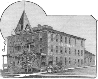 The elegant hotel of Neillsville, in the late 1800s, was The O’Neill. Located on the corner of 6th and Hewett, it featured an inviting dining room that served delicious food in a pleasing atmosphere. On special occasions, the guests could enjoy dancing to music provided by talented musicians. A barber shop, bar and lobby were also on the main floor.