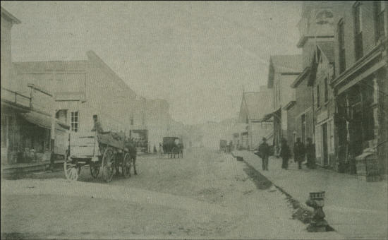 A view from the corner of West Street and Fifth Street in Neillsville, looking east, circa 1890: On the left Wiesner House, Meat Market and Marsh Bros. Store. To the right, Luddington Harness Shop, old City Hall, the Hemp Store and Presbyterian Church. Note the belfry tower that sheltered the fire bell, below it on the city hall roof.