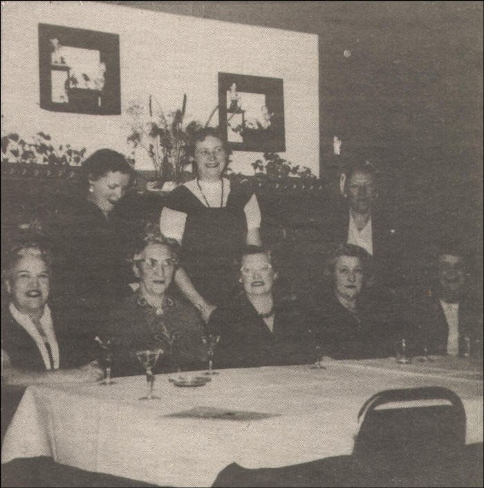 December is the month for Christmas Season parties and has been through the years. These Neillsville ladies belonged to a bridge club and like other organizations enjoyed going out to eat once or twice a year. On this special occasion (circa 1950) they dined at the Fireplace Supper Club, west on Highway 10. Front row, left to right: Esther Perry, Beth Munger, Lorena Rude, Aleta Allen, and Edna Russell; back row: Evelyn Schwantes, Marie Covell, and Harriet Peterson.