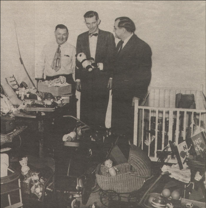Neillsville Chamber of Commerce toys for Christmas in 1951. Left to right: Harold Trewartha, Director of Social Services; Herbert Smith, Sec.-Treas. and James A. Musil, president of Chamber of Commerce. Do you recognize some of the toys looking like those you had in your house during the 40s-50s? The tricycles, stars & stripes rubber ball that was red, white and blue, the dolls and that little animal squeaky toy-their look-a-likes shared the toy room at our home.