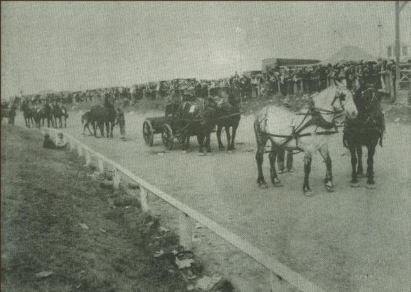 Horse judging at the Clark County Fairground, such as during Fair Week c.1920, was a yearly event. This photo was taken as the teams paraded around the race track. The second team was owned by Charles Hubing, who is viewed sitting in the wagon, accompanied by his brother Art. The third in line, a mare and her colt, were also owned by Erickson, being led by his brother, George. Notice the large number of people around the track and in front of the old grandstand. When Hubing traveled to the Marshfield Fair, George Erickson accompanied him, with several horses in tow. A team was hitched to a wagon, a couple colts ran along side, and some haltered steeds were tied to the back of the wagon. One man drove the team while the other man sat at the back of the wagon, caring for the other horses as they made their way down Hwy. 10.