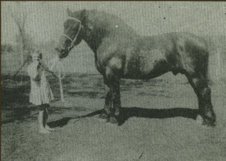 “Big Master” the Percheron stud, was owned by Charles Hubing. Hubing’s daughter, Charlotte, held the lead rope as the picture was taken