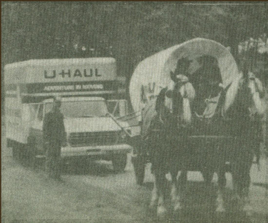 The City of Neillsville celebrated its Centennial in 1982. One of the units in the celebrated parade was that sponsored by Gene Ross Auto Clinic. Depicting the mode of hauling during moving, one hundred years ago in comparison to 1982, George Erickson drove his Belgian team, June and Princess, with a covered wagon as Gene followed with a present day U-Haul truck. In earlier years, George Erickson and Leo Hemp often combined their two Belgian teams to make up a 4-in-hand hitch for parades.