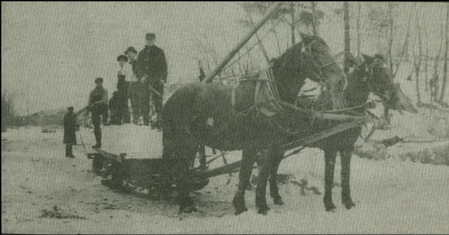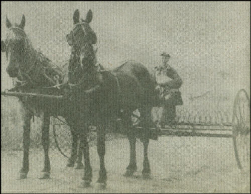 Rocky (left) and Nina a light team owned by Wm. Joyce, Sr. Rocky, a strawberry roan, and Nina were half-Morgans, with Rocky being considered very intelligent and somewhat cantankerous. One of Rocky’s habits was to free himself from his stall and indulge in the molasses bin. The next morning he would be found with his head cover (covered) from ear to ear with molasses and hay. Shown with the team are Wm. Joyce, Jr. and “Frosty”.