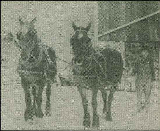Colonel (left) and Bob a team of heavies, owned by Wm. Joyce Sr. Visible in the photo are the graduated rings through which the lines were run to keep them from becoming entangled in the neck-yokes of the harness. Wm. Joyce is shown holding the lines.