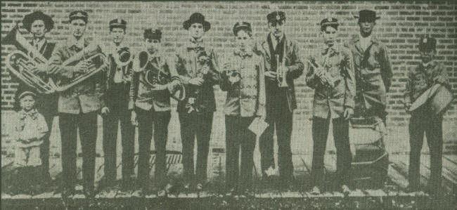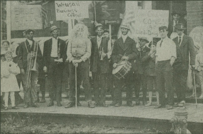 Photo #6: A “pep band” in front of the Loyal Drug Store. Posters on the front window advertised a baseball game with the Wausau Business College team to start at 3 o’clock. Ice cream cones were advertised on a poster $.05 each at the drug store. It was the days of the boardwalk and when little boys went barefoot during the summer. In recent years, we have seen the Loyal Hobo Band marching and playing in their annual Corn Festival. Apparently the tradition of a pep band has carried on through many years.