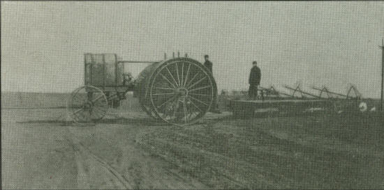 Field work being done by one of the early tractors in 1913. It was owned by Martin Jacobson.
