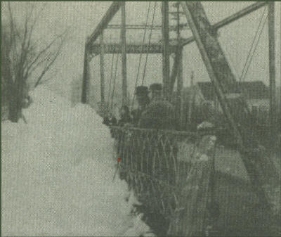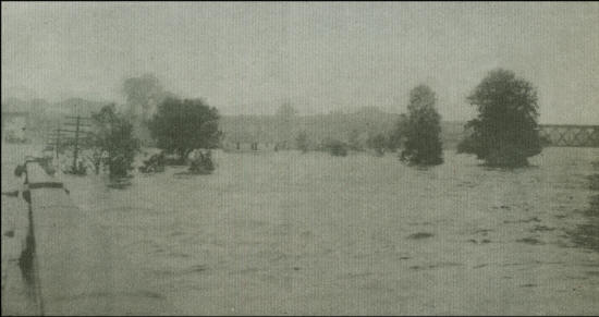 The 1938 flooding of Black River as it appeared along the Highway 10 Bridge on Neillsville’s west side. At the right, in background, is the old railroad bridge which spanned the river.