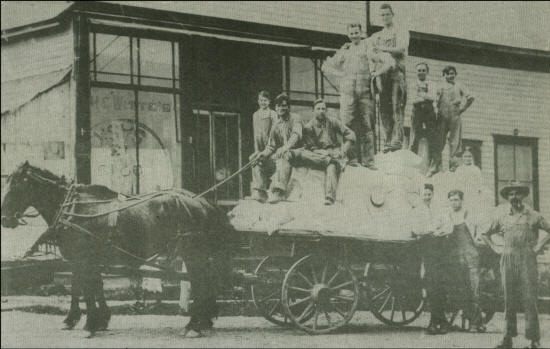 This scene was captured by the photographer, in 1913, in front of the H. C. Witte general store in Granton. Those on the wagon, left to right, were Carl Storm, Rudy Sternitzky and Hank Neinas, (next two unidentified) Leland Gerber, Erhart Witte and Rosetta (Beaver) Meyer. The only one identified standing in front of the wagon, to the left, was Philmore Kemmeter.