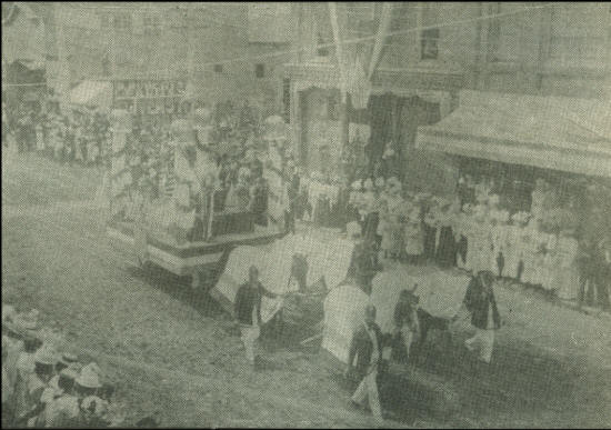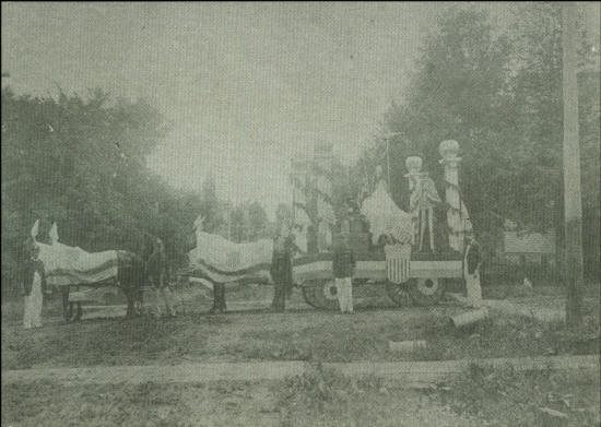 A 4th of July float, sponsored by Marsh Bros. Store, participated in the parade that made its way up Hewett Street during a late 1800’s celebration. The float was photographed in front of the Marsh Store, on the northwest corner of 5th Street intersection.