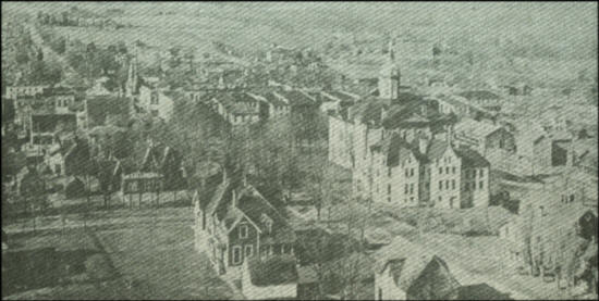 Late 1800’s view of Neillsville, east side, with old county court house and jail in foreground