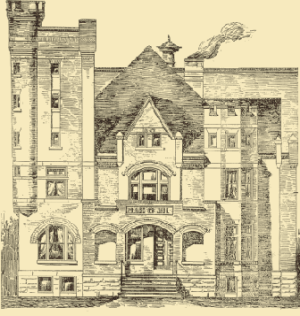 The Times presents an engraving of the front elevation of the substantial and elegant county jail and sheriff’s residence, which will be built during the building season of 1897 east of the court house in this city. It will be of cut stone and pressed brick, two full stories and a large attic, as to the residence part above the water tables, and a commodies basement. The outside dimensions will be 42 x 97 feet, including the jail, and throughout it will be a model.