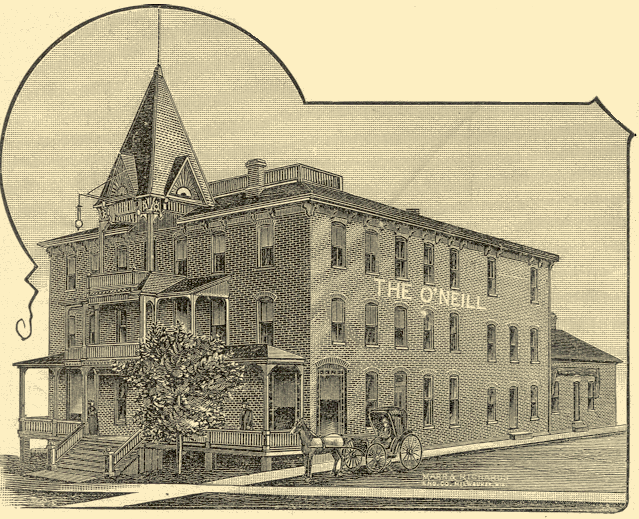 The O’Neill House built by James O’Neill was on the corner block of East 6th and Hewett Street now site of the Neillsville post office. The three story building was the most elegant of hotels in Central Wisconsin during the 1870’s. It was one of the first to have electric lights. Guests traveled from Black River Falls, Eau Claire, and other area towns for weekends of dining and dancing. First operated by James O’Neill, it was later sold to James Paulus, who operated it for a number of years.