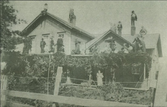 There seemed to be an era when people had photos taken just to have something to do. They would hire a photographer to come to their home or wherever to take pictures of family gatherings or of neighborhood get-togethers. Occasionally, photos such as this one will come to our attention. A little foolishness as you can see. Every person, except two, chose to be on the second story roof, porch roof or chimneys, all clowning around for the photographer. The ivy covered porch and un-mowed yard was typical of a farmhouse setting circa 1900. Though the photo was taken in the Neillsville area, we have no more information other than that.