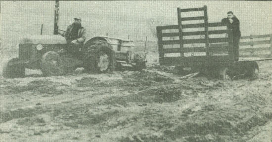 Walter Aumann had troubles when he hauled milk from his farm on the muddy road in spring of the 50’s. Aumann’s farm was located on Moonlite Road east of Highway 73. His son, Charles, was standing on the bogged-down hay rack.