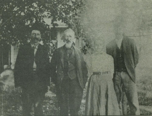 John and Sarah Winters with their sons; Thomas, on the left, and William, to the right; standing in front of their farmstead home.