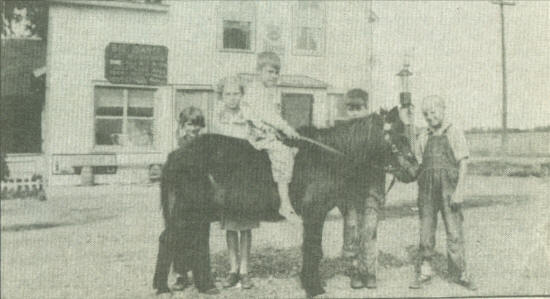 “The Shortville Corner kids” with a pony on a summer day, 1935-1936: (Left to right): M. Halle, Gladys Mortenson, Jack Hagie, Gordon Hagie and Bob Mortenson. Notice the sign on the building advertising a big dance at the Riverside Ballroom – (located near the Opelt Bridge). Something of the Shortville Ball Park, Music by – the rest is illegible.