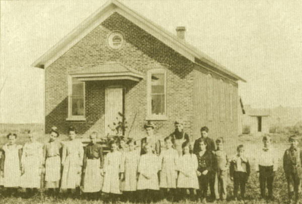 Near the top gable of the building is wording which reads Dist. #1, Town of Washburn, 1900. The outside school bell was added some time after 1912. Anna remembers the teacher using a hand bell with an 18 inch handle which she ran after noon hour and recesses. (Thank you, Anna, for your remarkable memory. Also, Thanks to Edith Short for the photo.)