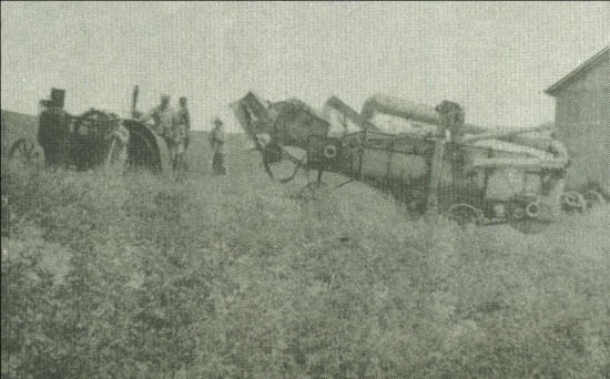 The Rumley Oyl Pull and threshing machine owned by Ed Hagie and used for custom threshing jobs in the Shortville area.