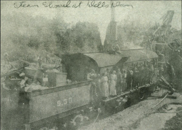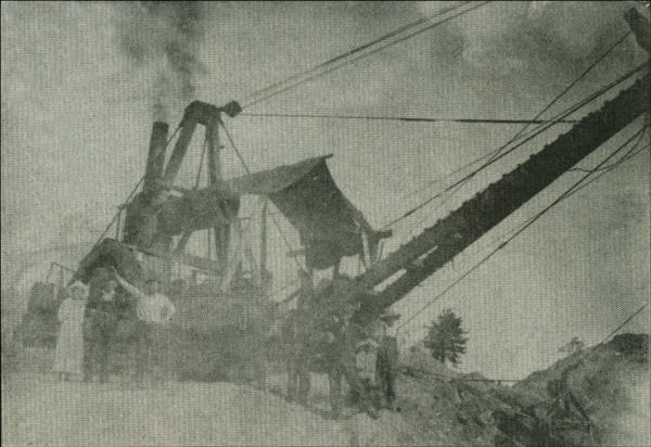 Men and women lined up on the steam shovel’s frame for a posing shot near the Dell’s Dam site.