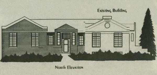 This Library plan drawing depicts the north side view with a ground level main entrance. The existing building on the right will remain with the new addition being erected and attached on the east side. The structural design will comply with the 1914 building in respect and gratitude of the Carnegie Library gift.
