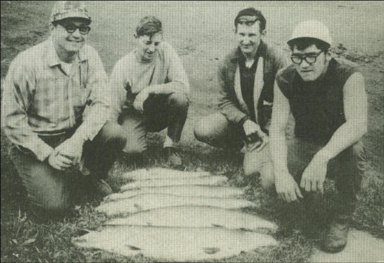 These fishermen have reason to be happy, look at their catch! In the spring of 1970 Douglas Larsen, Dale Opelt, Frank Zickert and Dennis Larsen went on a successful fishing trip. They caught six muskies on the Chippewa Flowage.