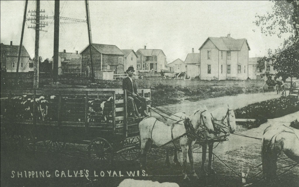 Shipping calves from the local stockyard was a common practice for farmers in the early 1900’s. Each town’s stockyard was located along the railroad track, not far from the depot. A weekly specified time was “shipping day,” when livestock was sold and shipped to the packing plants in larger cities. In 1909, Fred Garvin, of the Loyal area, chose to have this day remembered when he was photographed on the intersection of what is now Hwy 98 and Cty Trunk “K” on the Methodist Church corner in Loyal. It was the days of the boardwalk, visible at the street crossing. The water tower, in the background, stood as a familiar landmark, for many years, verifying the location. The horse-drawn, well-built wagon, served as a livestock carrier, the days before the motor driven trucks and trailer. (Photo courtesy of Ardyth Braiser Rossow)
