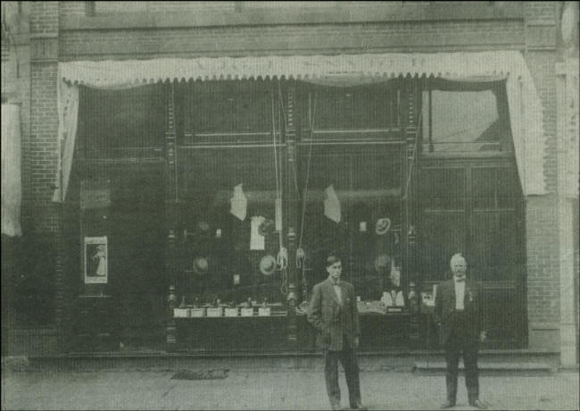 Herb Brown, Clerk and August Snyder, owner, standing in front of the August Snyder’s clothing Store, a Hewett Street business, circa 1900.
