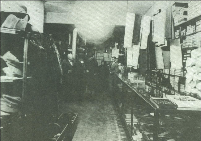 August Snyder Clothing Store on Hewett St., Neillsville, early 1900’s. To the left was a rack of men’s fur coats. Notice the celluloid collars for men’s dress shirts on the right, above the counter.