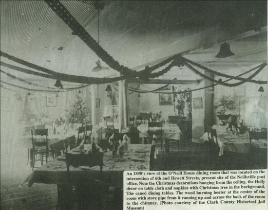 An 1890’s view of the O’Neill House dining room that was located on the intersection of 6th and Hewett Streets, present site of the Neillsville post office. Note the Christmas decorations hanging from the ceiling, the Holly décor on table cloths and napkins with Christmas tree in the background, and the caned dining tables. The wood burning heater at the center of the room with stove pipe from it running up and across the back of the room to the chimney. (Photo courtesy of the Clark County Historical Jail Museum)