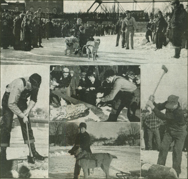 While the wood choppers blazed away, with their axes on the white oak logs, the junior contestants “warmed up” their dogs on the oval ice-floored track – and attempted to keep their pets in line.