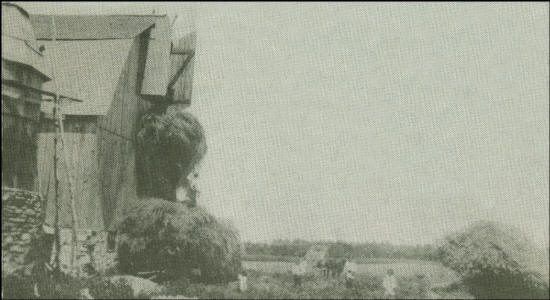 The Sebesta dairy farm: circa 1920, six miles south and one and a half miles east of Neillsville. The family is shown in the process of putting hay into the barn on a summer day. Mrs. Sebesta drove the team pulling the rope that carried the fork full of hay up into the barn’s hay loft. The couple’s four children stood nearby, watching. The family built the silo with stone base and vertical board sides. (Photo courtesy of Robert Sebesta, Sr.)