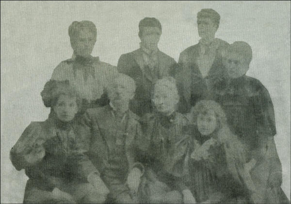 The Schuster family, front row: Gertie, Mr. and Mrs. Herman Schuster, and Irma. Back row: Carrie Lee, Kernel, Jeff and Mattie.