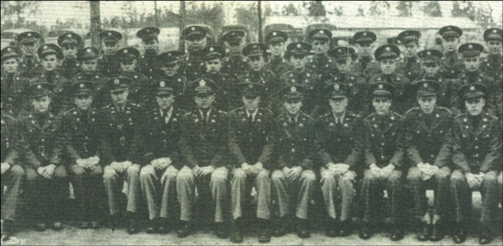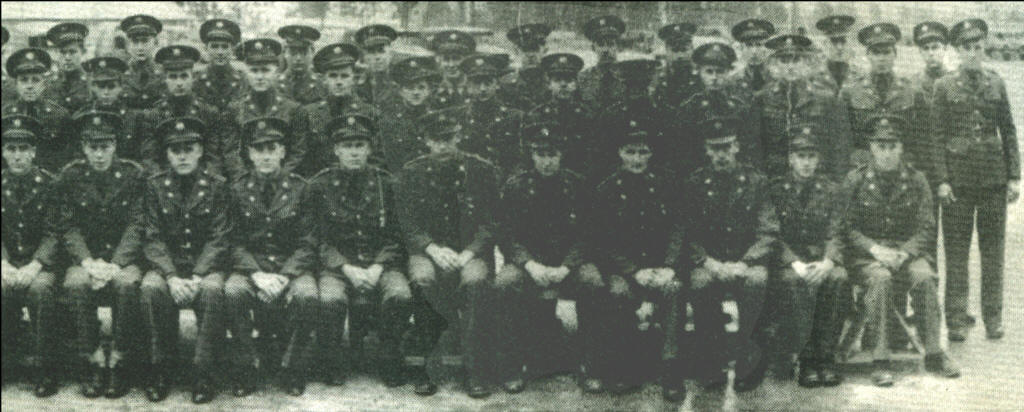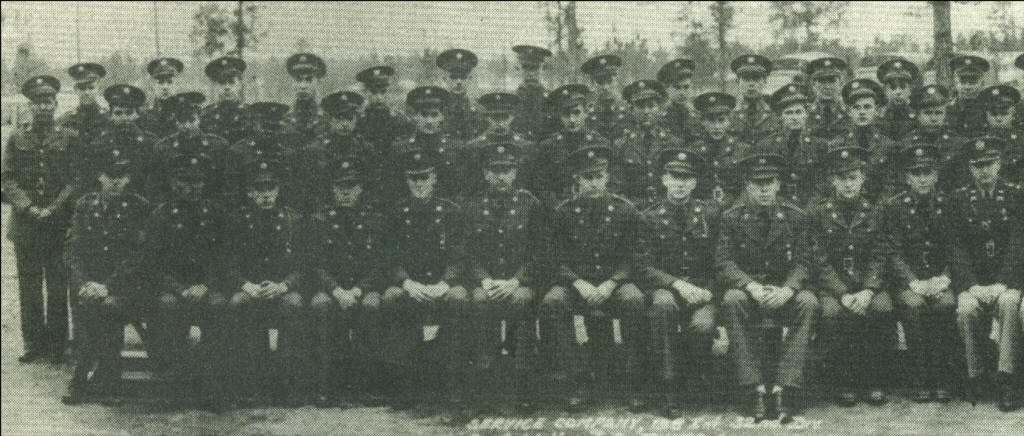 Front Row Left to Right: Theodore W. Viergutz, Jesse A. Mike, William Neville, Jr., Louis A. Zschernitz, Arthur R. Wagner, Ernest M. Fremstad, Robert E. Lindahl, Elmer R. Barr, Harley F. Jake, Francis R. Welsh, Earl L. Darling, 2nd Lt. Homer E. Wright, 1st Lt. Archie H. Van Gorden, Capt. William B. Tufts, Capt. Marvin A Eide, 1st Lt. Robert W. Schiller, 2nd Lt. Mack J. Fradette, Eugene J. Heintz, Sheridan T. Flynn, Kenneth M. Wagner, Harold D. Gault, Norman C. Lynch, Jacob A. Sonnentag, LaVerne C. Gaier, Charles W. Schweindler, George H. Campbell, Frank Wucki.