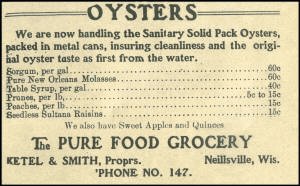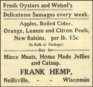 Sol Jaseph has opened a “Nine Cent” store and offers this invitation: I take this opportunity to inform the citizens of Neillsville and Clark County that I have opened a new grocery, book and stationery store at my old stand on Court Street. I should like to meet all my old patrons and as many new ones. Every article is sold for cash. We never take a dollar – only ninety-nine cents or nine cents. Come to see me – seeing is believing! S. F. Jaseph