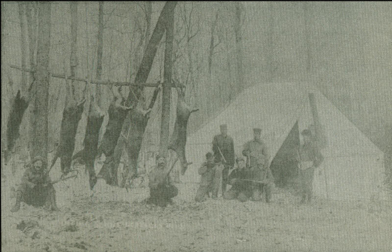 Deer hunting camp as it was circa 1920. A tent set up in the woods, a portable wood heater and cots sufficed as temporary living accommodations. A pole with six deer recorded a successful hunt.
