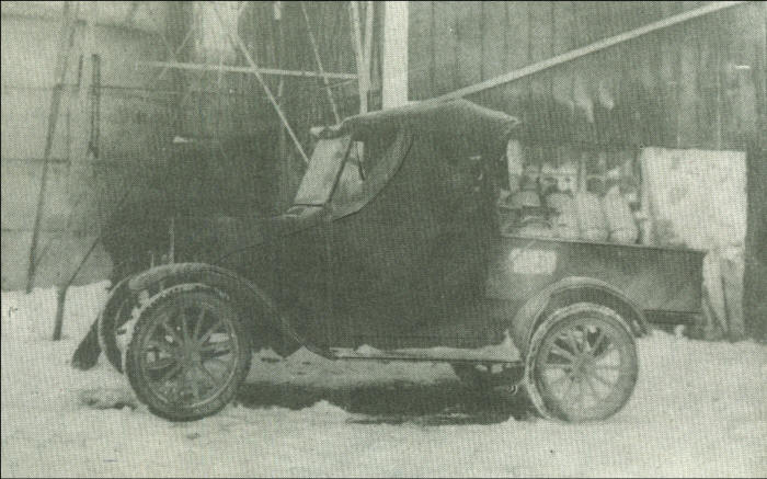 An early pickup, circa 1920, owned by William Joyce, Sr. served as a milk hauler on his farm. The canvas top and side curtains certainly didn’t keep the cold weather out as many of us can remember.