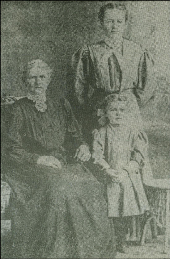 Caroline Gerlach, a hardy pioneer, accompanied her husband, Sam, coming to Clark County in 1870. As a couple they worked hard to establish a farmstead out of the wilderness. Caroline is shown in a long skirt characteristic of the turn of the century. At her right are her daughter Amelia (Davis) McHone and her granddaughter, Caroline McHone.