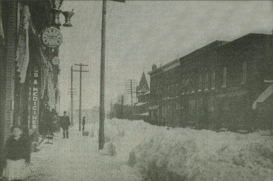 Snow banks of 1904 on Hewett Street, Neillsville, as viewed from the 5th Street intersection, looking north. The apothecary symbols of both drug stores and clocks designate jewelry store fronts. The right side of Hewett views the O’Neill House on far end of the street with former Post Office site at the first building that’s in the scene. The Republican Press newspaper and printing sign is posted on the side of the post office building. (Photo courtesy of the Clark County Jail Museum)