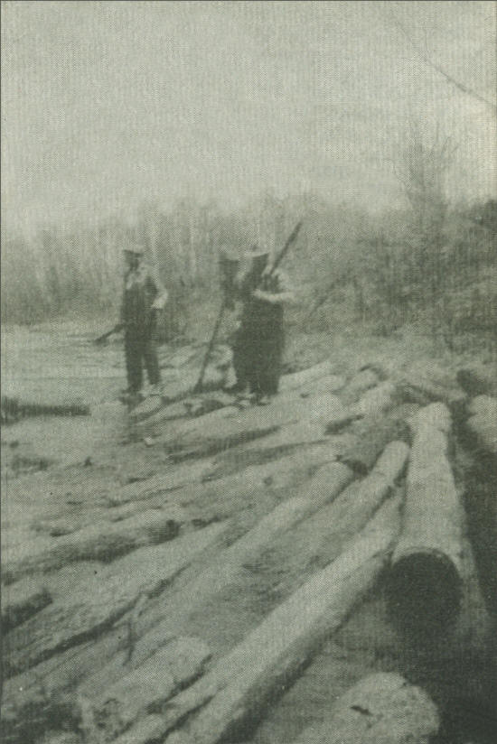 Loggers overseeing a “break-away” as the logs piled along the river bank were started rolling by the help of pike poles. (The Tibbett crew of circa 1930)
