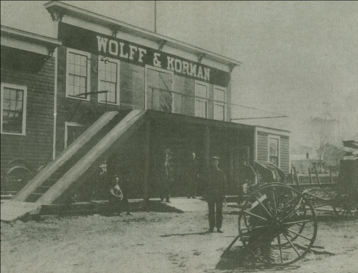 Wolff & Korman Carriage Shop along O’Neill Creek and Hewett Street was a booming business in its day. The two story building accommodated a large assembly area. The blacksmith shop with forge was on the first level. Notice the double doors and platform with ramp & stairs at the second floor’s front. The completed carriages were rolled down the ramp, ready for sale. Iron wagon rims or shoes are visible along the front of the building. A farm implement in the foreground was probably manufactured there, too. It looks like a grain seeder as there is a box on top with shovels visible below, circa 1900. (Photo courtesy of Clark County Historical Society Jail Museum)