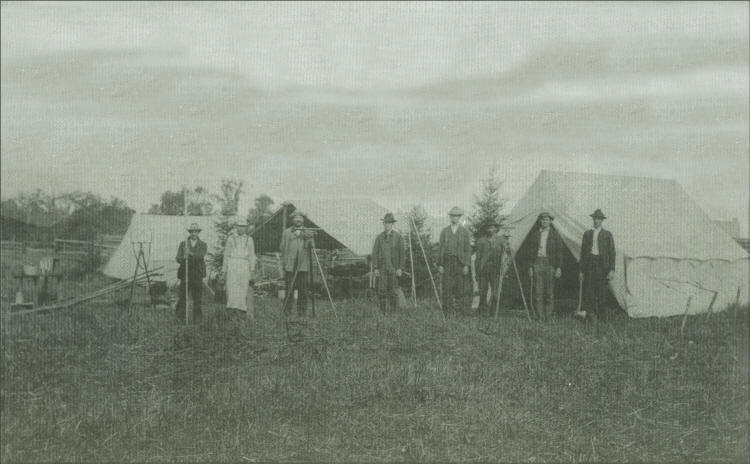 A surveying crew “on-the-job” in the late 1800’s, set-up camping site as they made their way over the land; three of the members were identified, far left, holding a pole, “Bill” Stockwell; third from left, C. S. Stockwell (engineer) and third from the right, Herbert Quinnell.