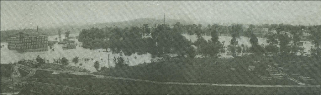 A turn of the Century view of O’Neill Creek and Black River over the banks; taking on the appearance of a large lake. At the far left, the Neillsville Furniture Factory was partially flooded, as well as the railroad tracks going west of the city. The houses on the far right are along North Grand Avenue.